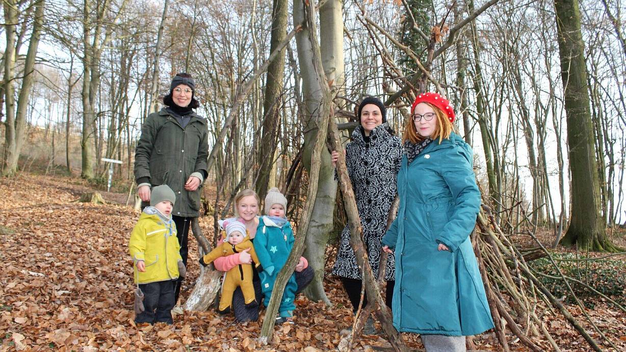 Janine Lütkemeier mit ihrem zweijährigen Sohn Marten (v.l.), Mareike Rieger mit ihren Töchtern Nea (6 Monate) und Kari Anni (2), Maria Papakosta-Schurkus und Augustine Gueffroy wollen gemeinsam mit noch anderen Eltern einen Waldkindergarten in Rödinghausen auf die Beine stellen. | © Anastasia von Fugler