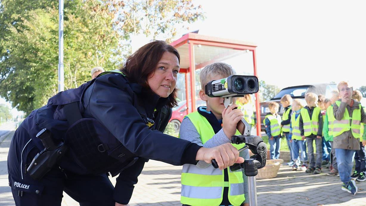 Polizeihauptkomissarin Jennifer Landwehrmeyer misst mit dem fünfjährigen Leonard die Geschwindikeit. | © Henrike Buschmann