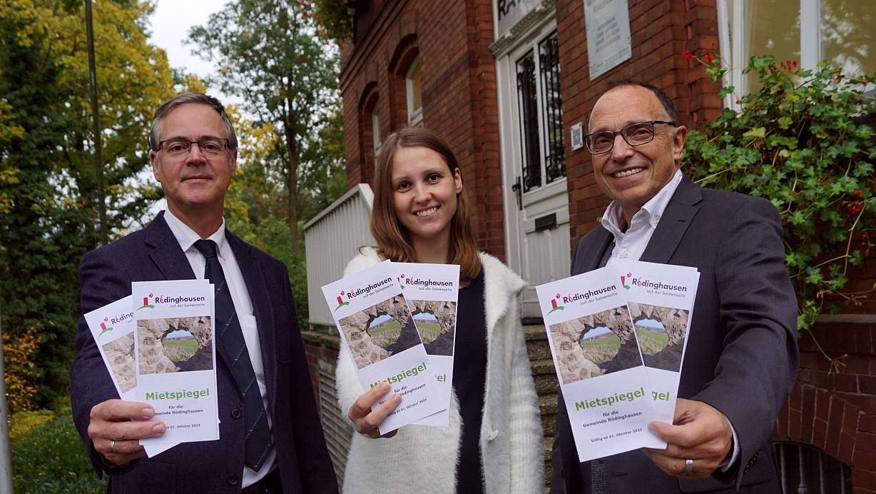 Thomas Dahlmeier (v.l.), Linda Bokel und Bürgermeister Siegfried Lux präsentieren den neuen Mietspiegel für die Gemeinde Rödinghausen. Foto: Gemeinde Rödinghausen | © Gemeinde Rödinghausen
