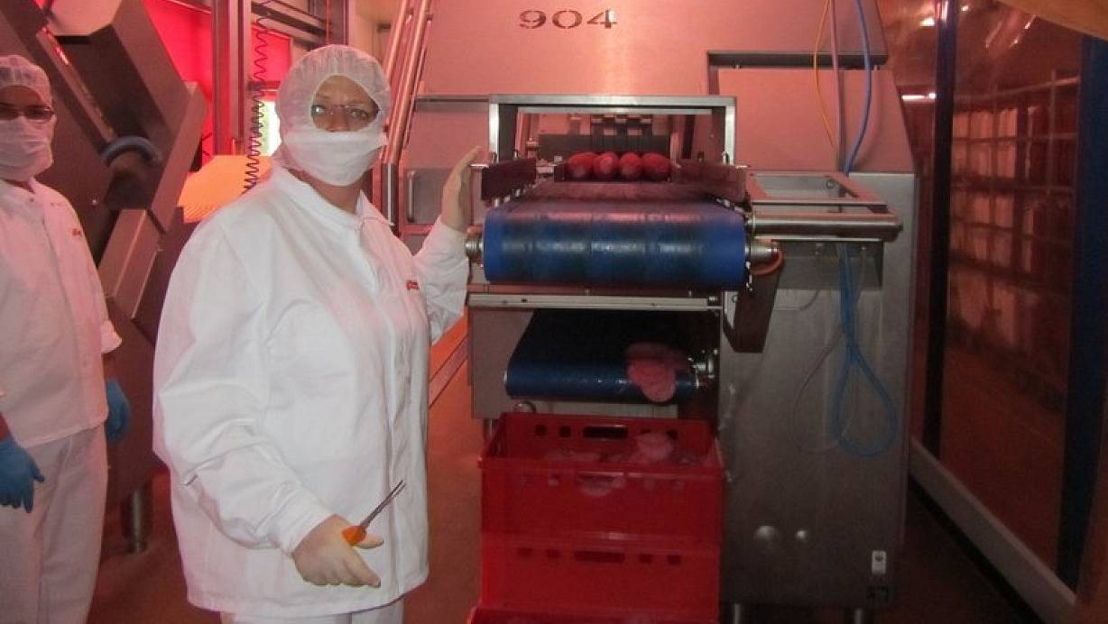 Am Nachmittag begleitete Angela Lück den Produktionsleiter Rainer Störmer auf seiner Tour zur Produktionsstätte in Bünde und konnte die handwerkliche Arbeit beobachten. Störmer ist maßgeblich an der neuen Salamispezialität "Kabanos" beteiligt, die bereits zweimal mit Gold von der Deutschen Landwirtschafts-Gesellschaft (DLG) ausgezeichnet worden ist "Es macht einfach Spaß, an neuen geheimen Rezepturen zu arbeiten, und die schöpferische Freiheit und das Vertrauen der Geschäftsleitung zu haben, eigene Ideen realisieren zu können", so Störmer.