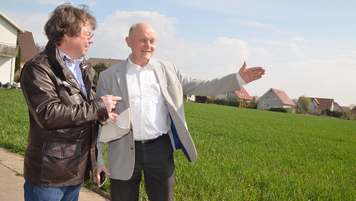 Heinz Schlüter (r.) zeigt NW-Redakteur Andreas Sundermeier , wo gegenüber von Wefing mal ein Supermarkt entstehen sollte. | © Mareike Patock