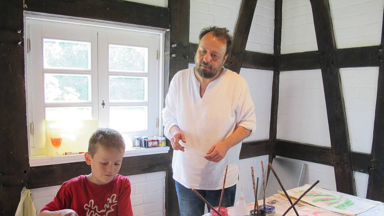 So gab es einen Kursus im Malen auf Wasser von Mutlu Yilmazer. Sylvia Middel vermittelte die Grundlagen der Steinbildhauerei und unter Anleitung von Sabine Stahr entstanden in heißem Feuer bunte Glasperlen. Des weiteren gab es Kurse im Papierschöpfen, Holzgestalten und Zeichnen. Christine Sordel-Brockmann seit Beginn an mit Workshops bei den Kreativ-Tagen dabei, sie ließ die Teilnehmer diesmal mit Acrylfarben experimentieren. In diesem Jahr bot sie auch wieder einen Kindermalkursus an, in dem sich die jungen Teilnehmer mit den Farben des Sommers beschäftigten. Außerdem konnten die Kinder einen Metallarbeitskursus belegen, bei dem sie mit einfachen Mitteln Schmuck, kleine Löffel und weitere Arbeiten erschufen. Auch der siebenjährige Silas hatte viel Spaß dabei und präsentierte stolz die Kette, die er für seine Mutter gemacht hatte. Geleitet wurde dieser Workshop von der Museumspädagogin des Werburg-Museums Sonja Voss, die außerdem noch Filzen anbot. Sie wollte den erwachsenen wie auch jungen Teilnehmern einen Einstieg in das alte Handwerk des Arbeitens mit Metall geben. Dabei war es ihr wichtig, dass man mit einfachen Mitteln zu einem schönen Ergebnis kommt. „Man bekommt ein Gefühl für das Metall und hat etwas in der Hand", sagt sie und zeigt eine Rosenblüte aus Metall.