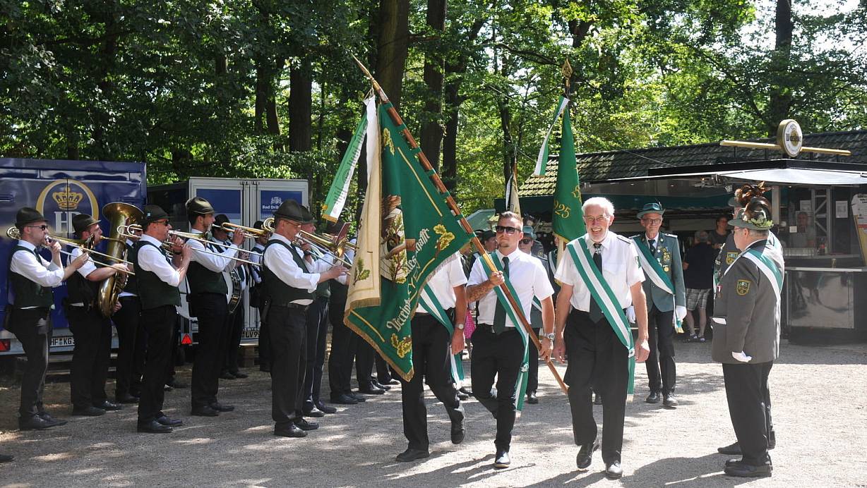 Spenge - Lenzinghausen. Festliche Musik erklingt auf dem Platz im Schützenwäldchen in Lenzinghausen. Mit hoch erhobenen Flaggen marschieren die Fahnenträger des Schützenvereins ein, gefolgt vom Königspaar Marcel und Daniela Stude. Vorbei am angetreten Gefolge geht es zur geschmückten Kutsche, um den Umzug durch das Dorf zu beginnen.