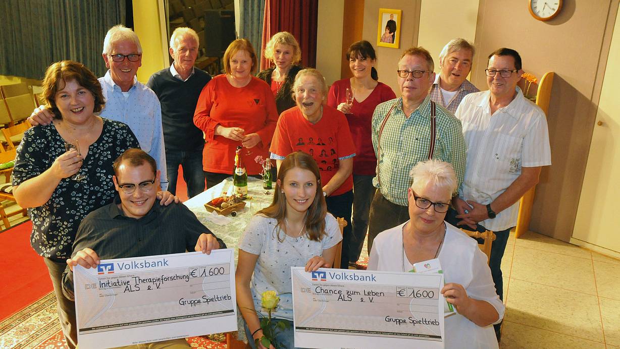 ALS steht für Amyotrophe Lateralsklerose, eine Erkrankung des Nervensystems, bei der es zur Schädigung der Nervenzellen kommt, die für die Muskelbewegungen verantwortlich sind. Martina und Bernd Neubauer vom Verein „Chance zum Leben – ALS" nahmen von den Schauspielern der Gruppe Spieltrieb einen Scheck ber 1.600 Euro entgegen.