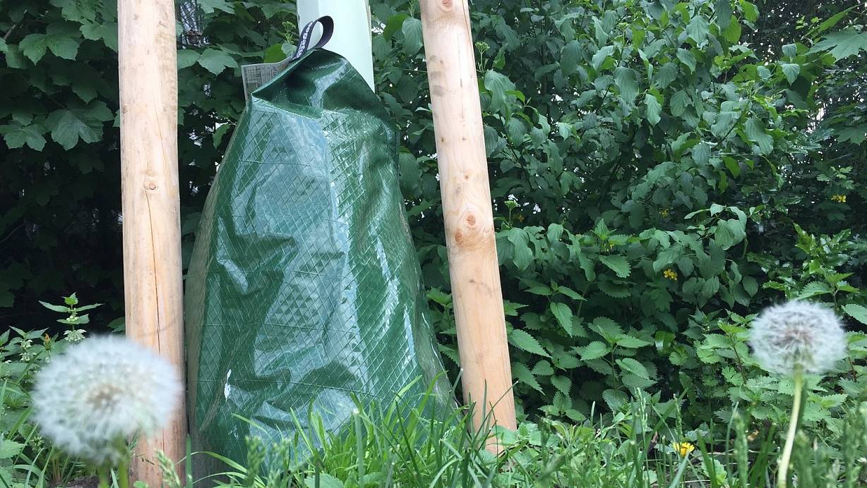 Wegen der Trockenheit wurden junge Bäume mit Wassersäcken ausgestattet. | © Susanne Lahr