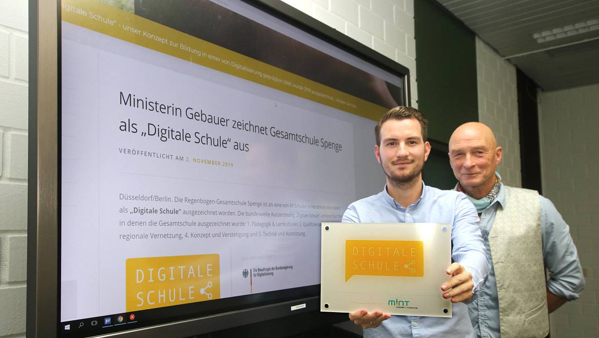 Ausgezeichnet: David Steffek (l.) und Hartmut Duffert sind stolz auf die Auszeichnung, die die Regenbogen-Gesamtschule Spenge jetzt in Düsseldorf bekommen hat. | © Andreas Sundermeier
