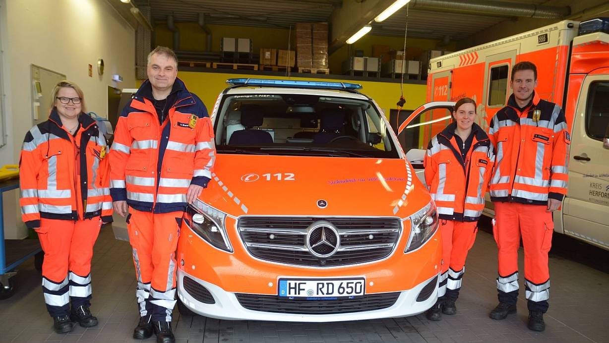 Rettungsassistentin Ina-Marie Jänsch (v. l.), Notarzt Matthias Brand und die beiden Notfallsanitäter Nina Bertram und Robert Dönnecke, hier mit dem Notarzteinsatzfahrzeug, sind derzeit ganz besonders gefordert. | © Mareike Patock