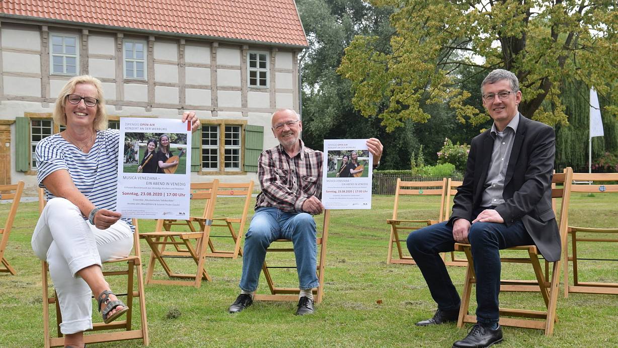 Heidrun Hellmann vom Stadtmarketing, Werner Best vom Werburg-Verein und Spenges Bürgermeister Bernd Dumcke (v. l.) laden zu einem Open-Air-Konzert mit venezianischen Klängen ein. | © Mareike Patock