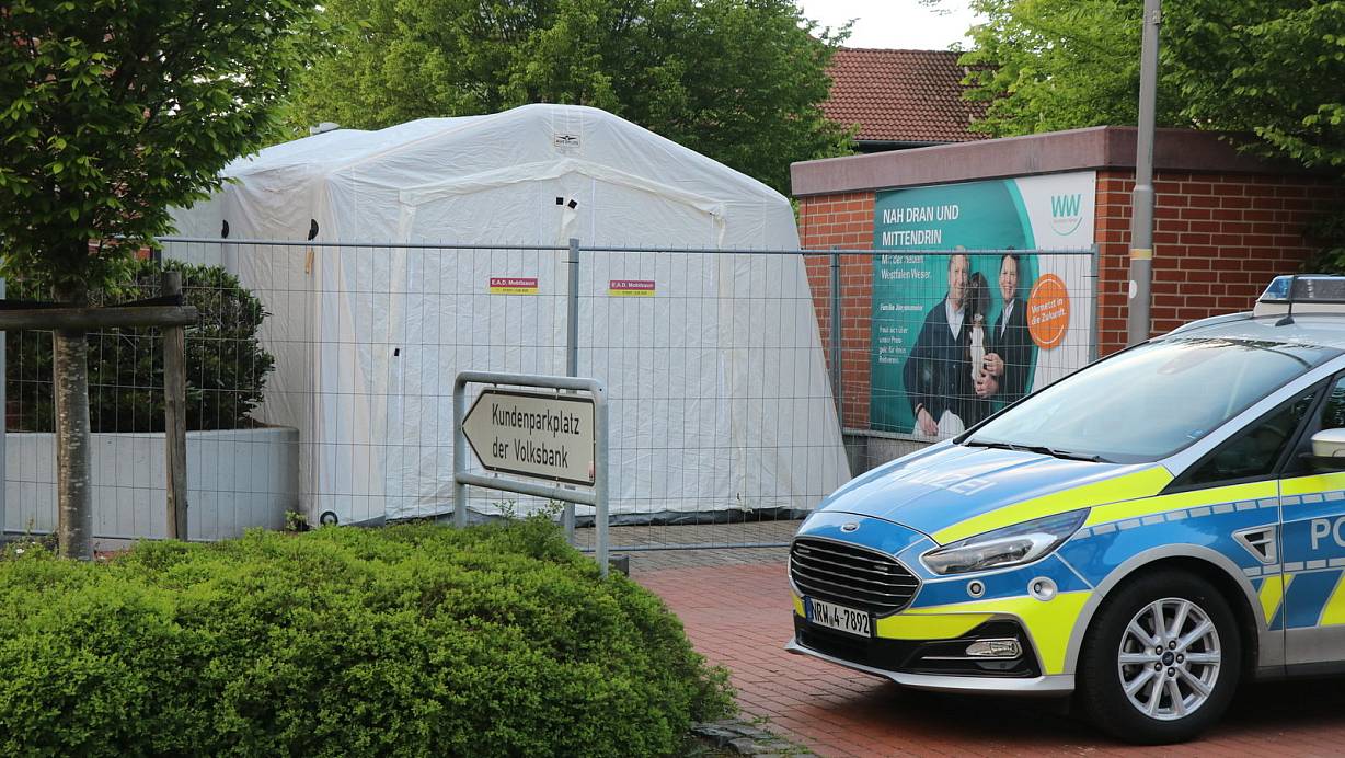Rechts neben dem Zelt, mit dem die Polizei den Tatort abschirmt, steht das Trafo-Häuschen. Von dort drinnen schufen sich die Täter einen unterirdischen Zugang bis zur Volksbank. | © Ekkehard Wind