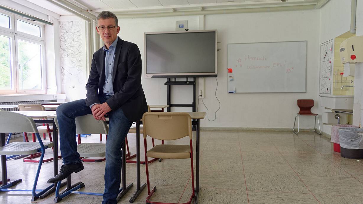 In diesem - und einem weiteren - Klassenraum im Keller der ehemaligen Realschule, das stellt sich Bürgermeister Bernd Dumcke vor, könnte die VHS ein Zuhause in Spenge finden. Selbst die modernen Bildschirme könnte die VHS gegebenenfalls übernehmen. | © Andreas Sundermeier