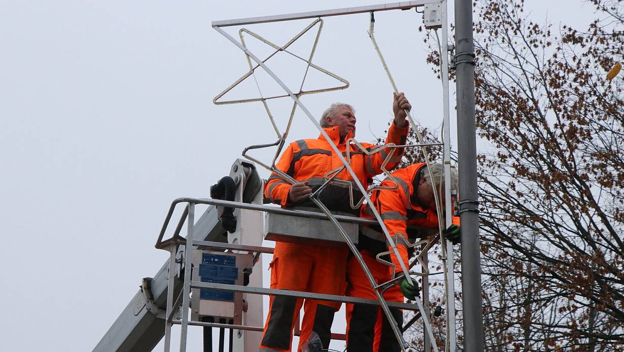 Mitarbeiter des städtischen Bauhofes hängen die Weihnachtsbeleuchtung auf. Das Rathaus an der Langen Straße wird zum Adventskalender.