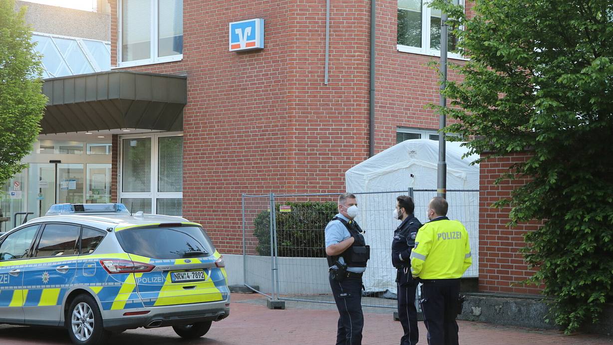 Schauplatz an der Volksbank in Spenge: Über der Stelle, wo die Täter ihren Tunnel gegraben hatten, hat die Polizei ein Zelt aufgestellt. | © Ekkehard Wind