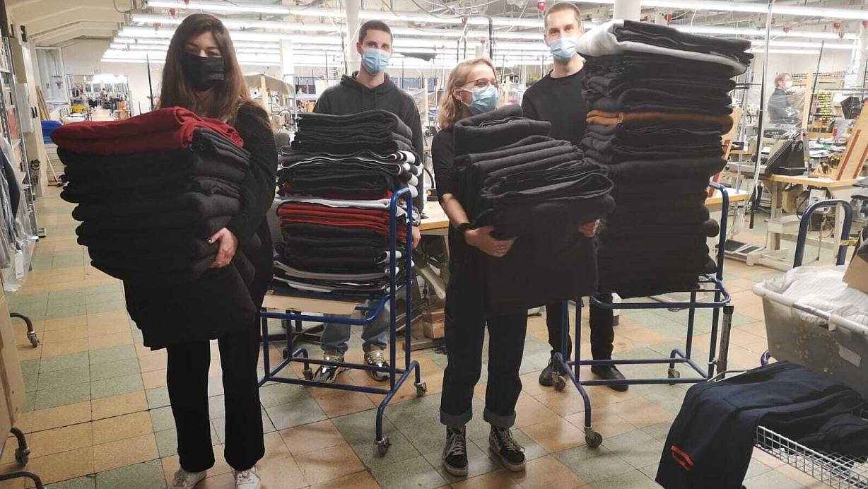 Auszubildende der Bugatti GmbH, Marie Spilker (v.l.), Jonathan Ehmke, Laura-Loretta Thierer und Moritz Berning helfen, die für die Ukraine gespendeten Decken ins Lager zu bringen. | © Guder