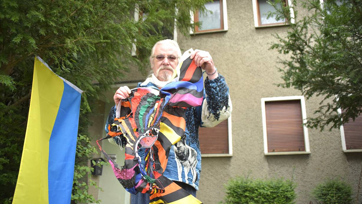 Reinhard Wehmeyer zeigt die Überreste der Peace-Flagge aus Kunstfasern, die Unbekannte in der Nacht zu Mittwoch vor seinem Haus in Lenzinghausen angesteckt haben. | © Andreas Sundermeier