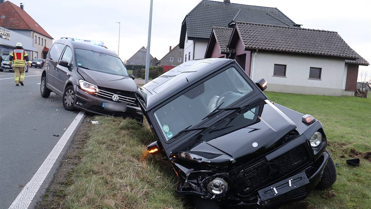 Demnach wurden die Beamten am Samstagnachmittag alarmiert. Bei Eintreffen der Polizisten stand ein stark beschädigter grauer VW Caddy auf der Fahrbahn und eine schwarze Mercedes G-Klasse befand sich seitlich im Graben neben der Straße.