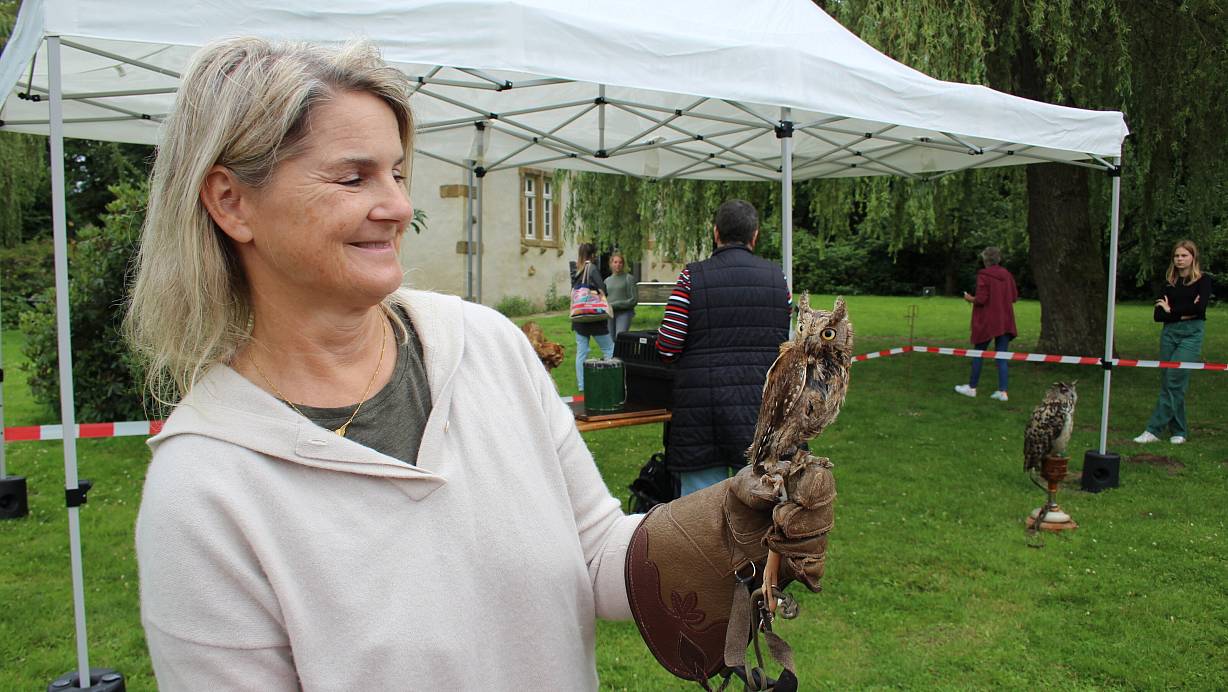 Marion Stein vom Falknerteam „Sabine Ehmanns-Kramp“ hat die Zwergeule Martha mitgebracht. | © Alexandra Stratmeier