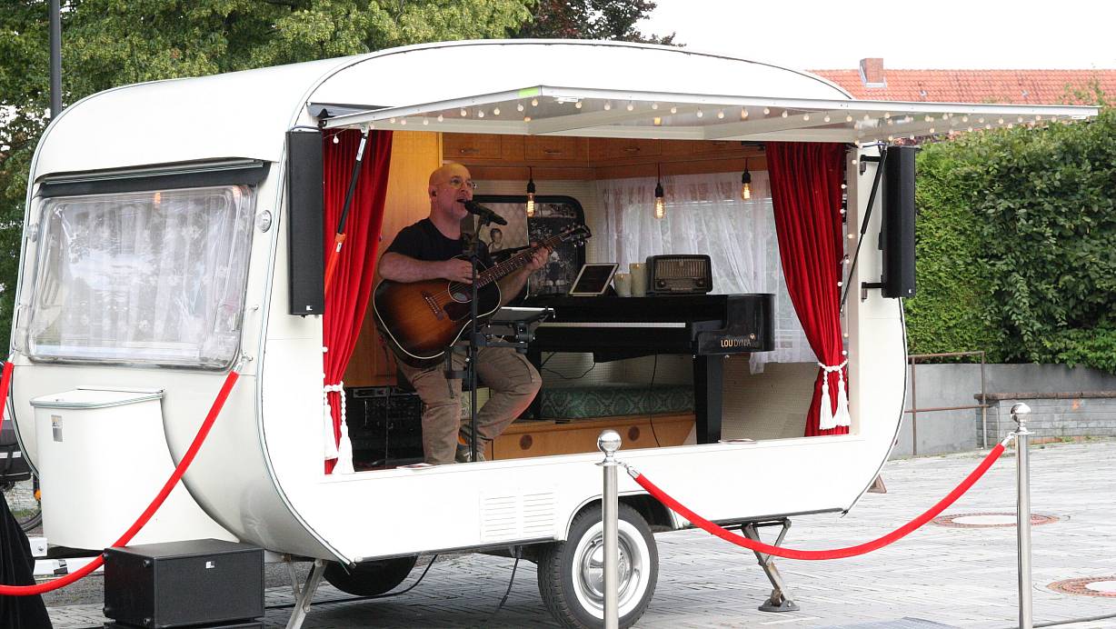 Lou Dynia war mit seinem umgebauten Wohnwagen ein echter Hingucker und sorgte für einen entspannten musikalischen Rahmen auf dem Blücherplatz. | © Britta Bohnenkamp-Schmidt