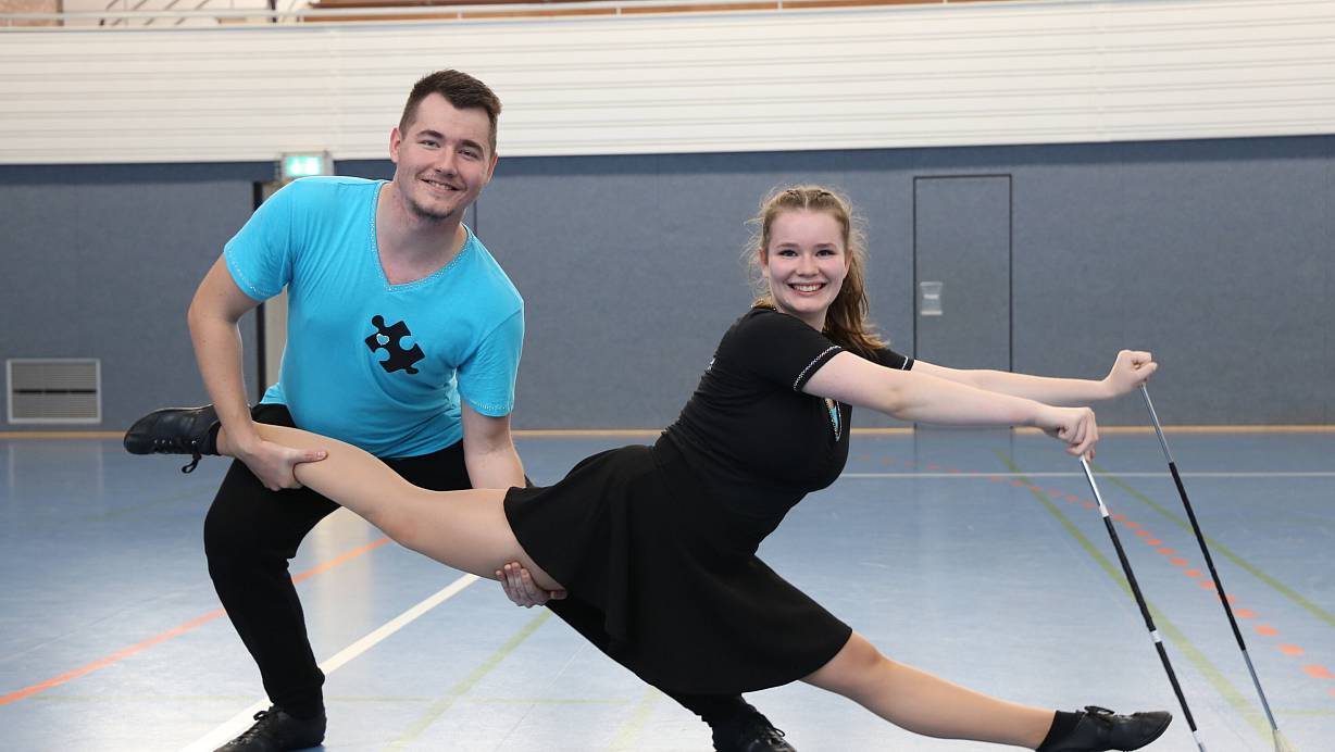 Michel Mindak und Schwester Luca Milana betreiben beide das Twirling. Das ist das Tanzen mit den Störkern, auf die sich Luca Milana Mindak auf dem Bild stützt. | © Lena Kley