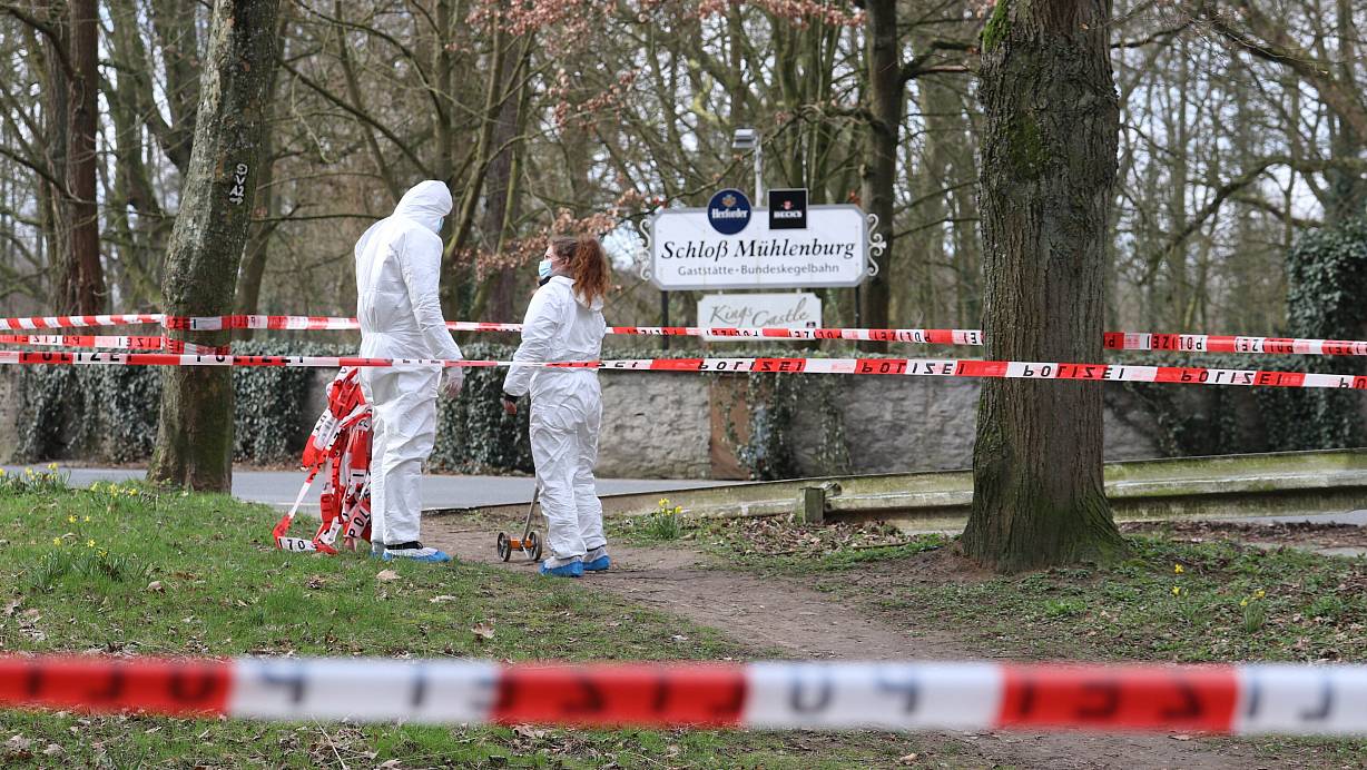 Spezialisten der Bielefelder Polizei haben am Sonntagmittag den Tatort rund um einen Parkplatz im Kreis Herford abgesperrt und Spuren gesichert. Die Täter sind noch flüchtig.
