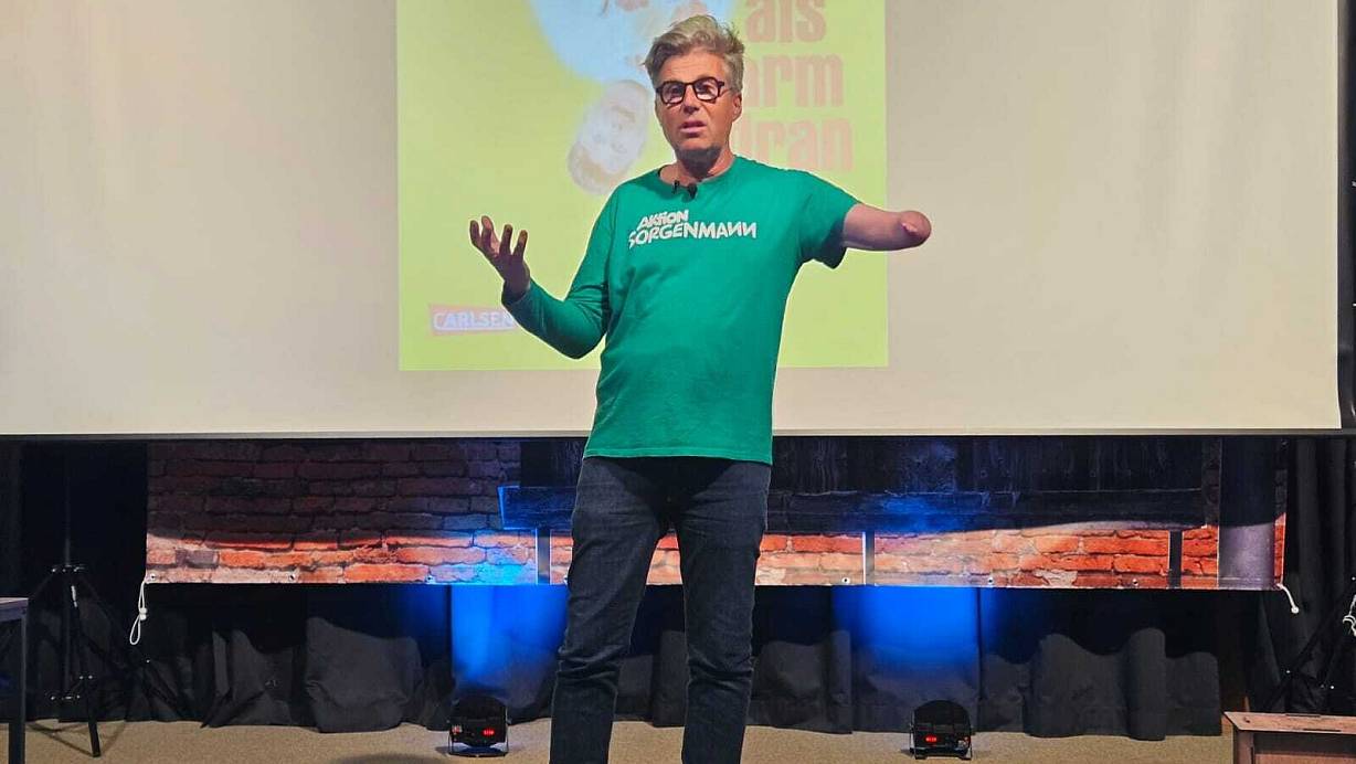 Comedian Martin Fromme nimmt auf der Bühne der Aula der Grundschule Spenge/Hücker-Aschen ohne Tabus seine Behinderung aufs Korn. | © Alexandra Stratmeier