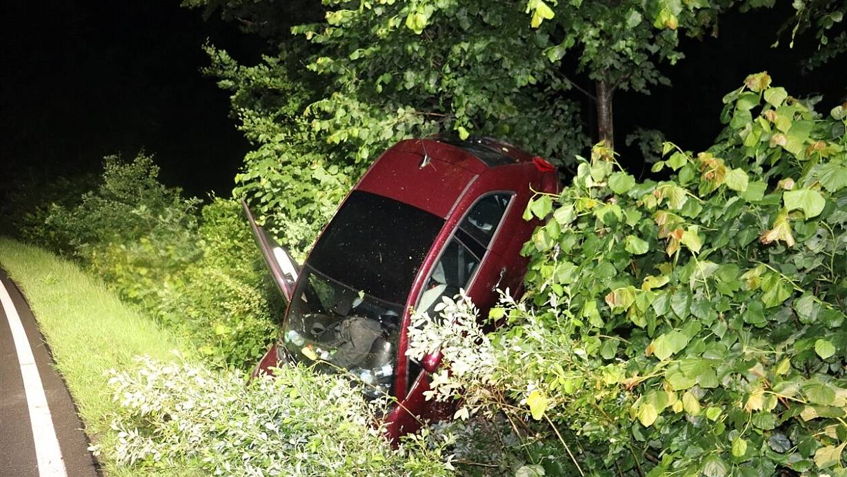 In einer Kurve verlor der Fahrer dann die Kontrolle über sein Fahrzeug und geriet ins Schleudern. Er kam anschließend nach rechts von der Fahrbahn ab, fuhr etwa 15 Meter durch den dortigen Straßengraben und kam dann mit der Front zum Boden gerichtet zum Stehen.