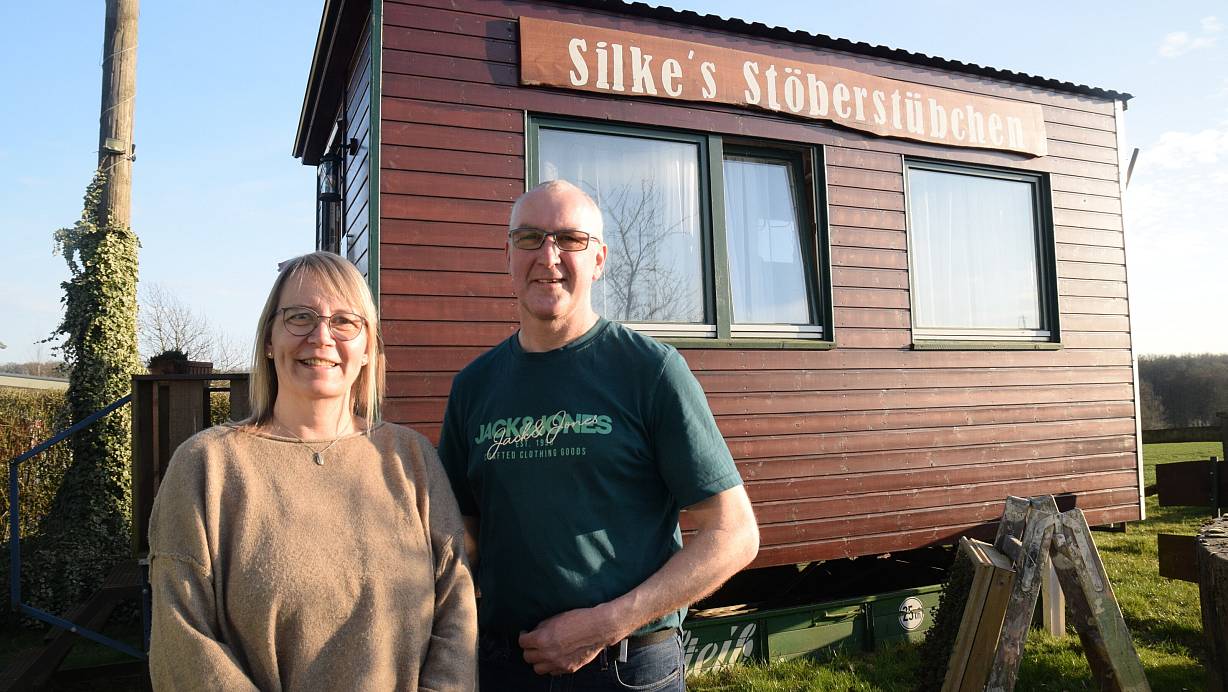 Silke und Stefan Upmeier vor dem selbstgezimmerten Bauwagen, in den "Silke's Stöberstübchen" eingezogen ist. | © Mareike Patock