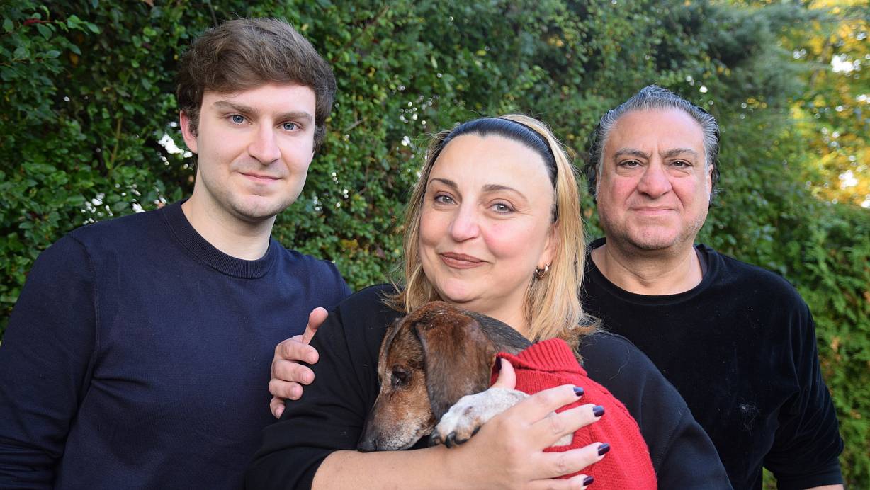 Heik Markosyan (l.), Mutter Irina Kalashyan und Vater Vahe Markosyan mit Dackel César im heimischen Garten in Spenge. | © Mareike Patock