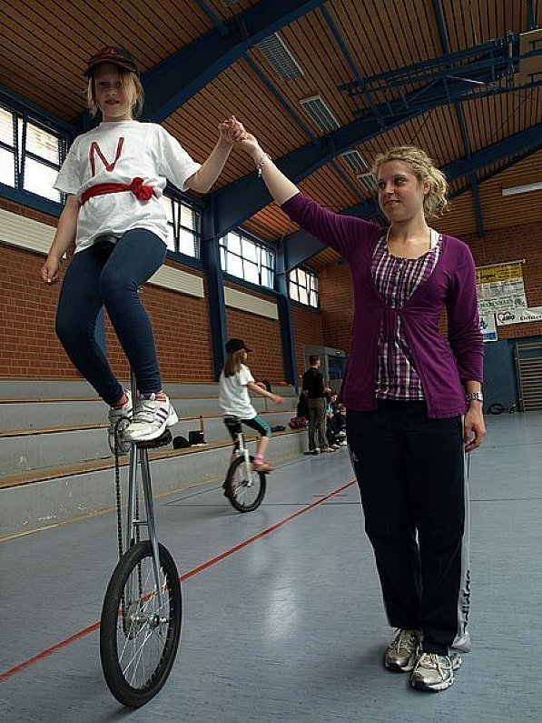 Neben dem Spaßeffekt sei das Einradfahren auch eine gute Körpererfahrung und spreche alle Muskeln an, sagt Koring. "Man muss sich selbst kennenlernen und das Gleichgewicht halten." Selbst lebhafte Kinder würden ganz ruhig und konzentriert dabei.