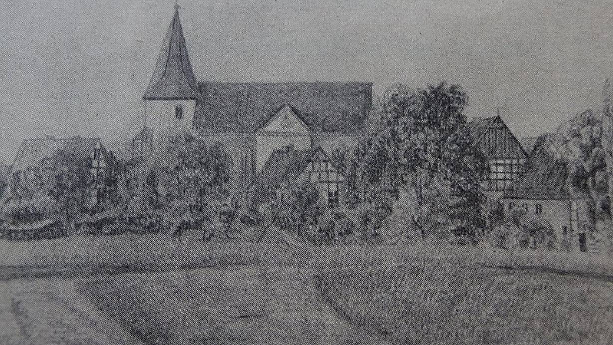 Das Bild hat viel Ähnlichkeit mit einer Fotographie, Ist augenscheinlich aber eine Zeichnung. Denn die ältesten Aufnahmen der Dorfkirche zeigen, dass sich die damalige Turmhaube viel stärker nach Osten neigte, als das hier nur angedeutet ist. Links von der Kirche erkennen wir das später, wegen des neuen Gemeindehauses aufgekaufte und danach abgebrochene Hofgebäude Stoffregen.