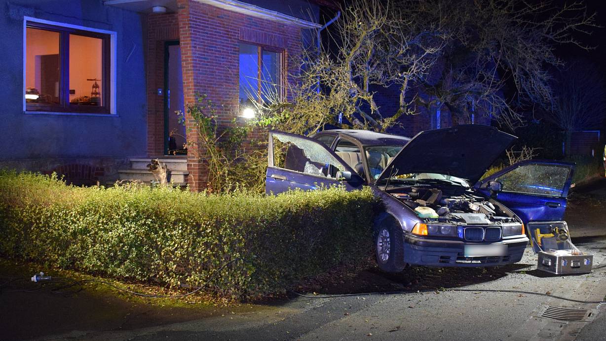 Eine Anwohnerin alarmierte die Polizei, da der Wagen ihrem Vorgarten landete. Der Fahrer musste ins Krankenhaus.
