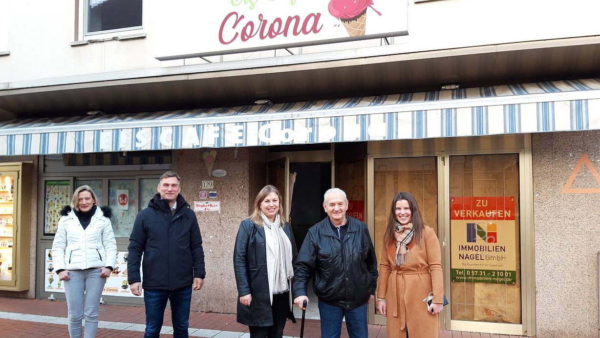 Von links nach rechts zu sehen: Marketing-Vlotho-Geschäftsführerin Christiane Stute, Vlothos Bürgermeister Rocco Wilken, Celina Kämpermann (Immobilien Nagel) , Bruno Corona (früherer Eigentümer der