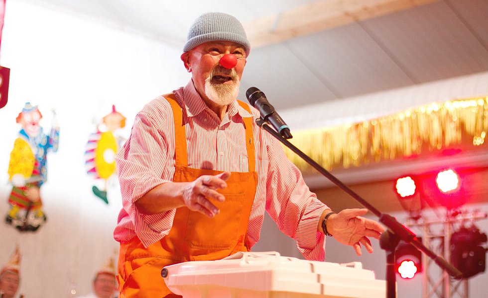 Begeisterungsstürme hervor rief das leicht bekleidete Nummerngirl Martha, das den jeweils neuen Programmpunkt anzeigte. Frisch gezapftes Bier und deftige Leckereien vertrugen sich gut mit den Witzen von „deä Müllmann“ alias Frank Bühler. Das freche Mundwerk des Büttenredners machte selbst vor dem Präsidenten der Vereinigten Staaten nicht Halt. Nicht ganz jugendfreie Szenen beim Arzt und leicht erotische Überfallkommandos unter dichtem Blätterdach beschrieb „deä Mann mött die Tonn“.