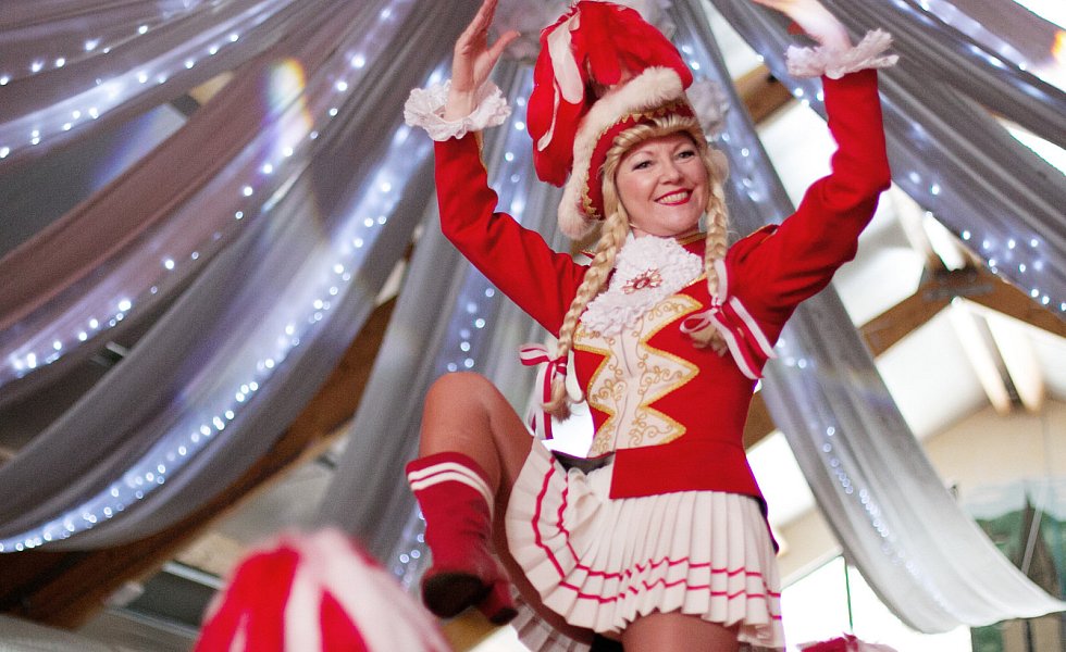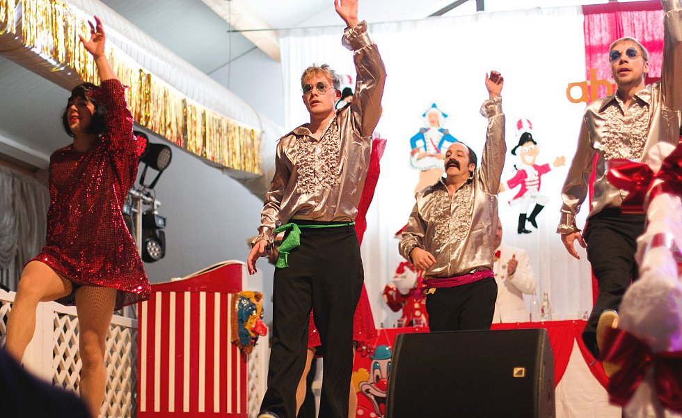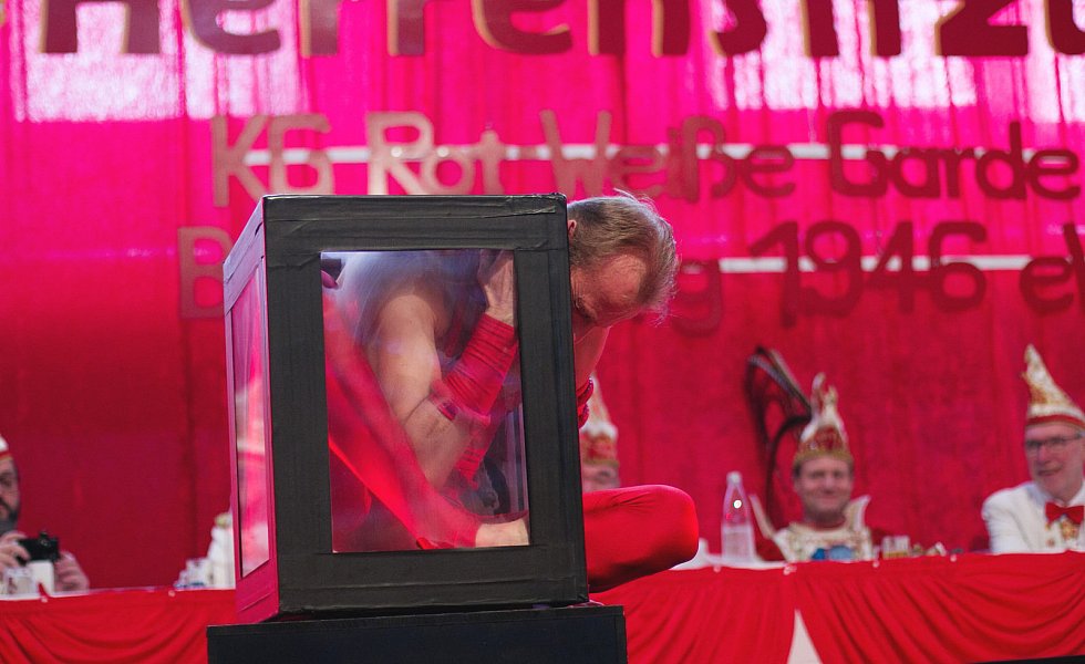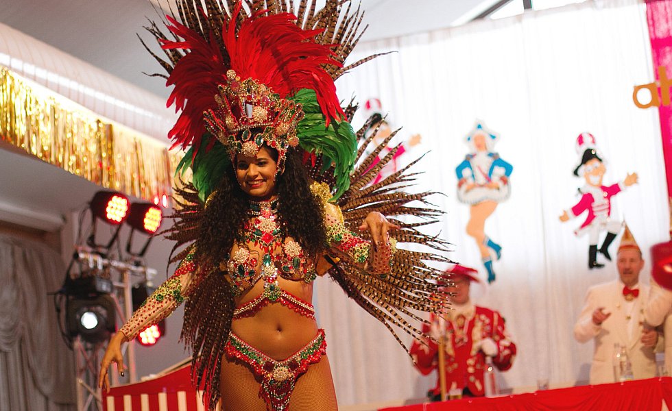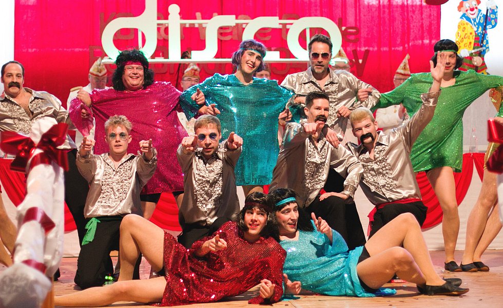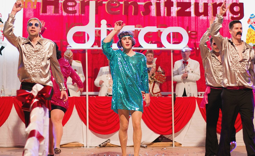 Funkelnd und federbehangen ging es weiter: Eine kleine Reise zum brasilianischen Karneval unternahmen die Teilnehmer der Herrensitzung zusammen mit den rassigen Tänzerinnen der Phönix Samba Show. Für kräftigen Lachmuskelkater sorgten die sich nicht allzu ernst nehmenden „Tornados“. Im stylishen Tanzoutfit und mit mächtigem Schnäuzer wurde eine kesse Sohle aufs Parkett gelegt. Cindy Laupers „Girls just wanna have Fun“ und MC Hammers „U cant touch this“ boten dabei die perfekte Untermalung.