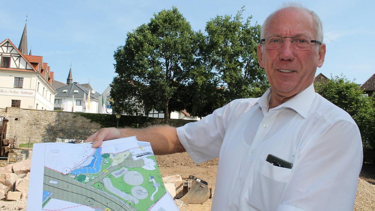 Für Jung und Alt: Architekt Lothar Beltz hat auf dem Spielbereich im neuen Bad Driburger Stadtgarten eine lange Tunnelrutsche, ein Trampolin, einen Vogelnestbaum zum Klettern und eine Wasserkurbel vorgesehen. | © Manuela Puls