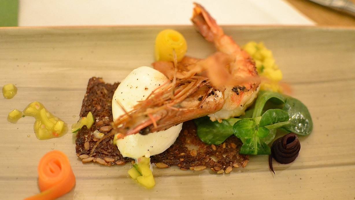 Los ging es in diesem Jahr im Hotel-Restaurant „Zum braunen Hirschen", wo das Team um Küchenchef Fatbardh Tominaj die kunstvoll auf dem Teller arrangierte Vorspeise servierte: Knackiges Wintergemüse mit Burrata und Garnele an einem fruchtig-scharfen Mango-Chili-Dip.