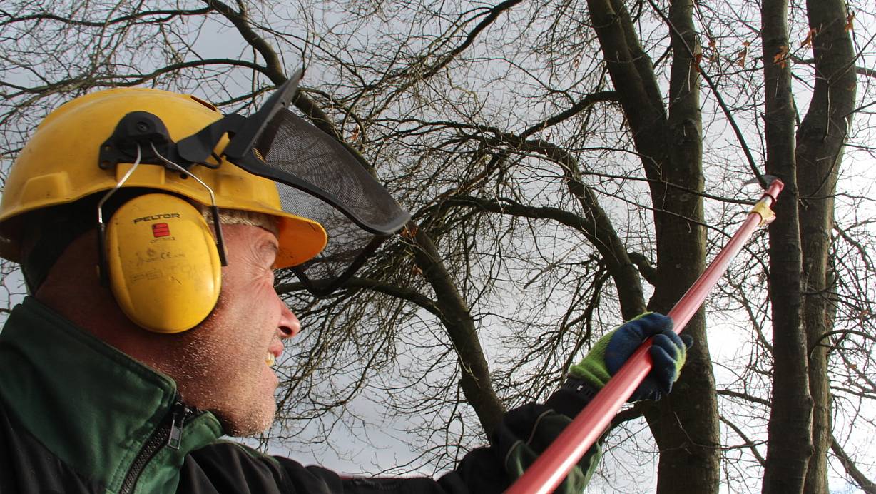 Baumpfleger Paul Sorby setzt die Teleskopsäge zeilgenau ein. | © David Schellenberg
