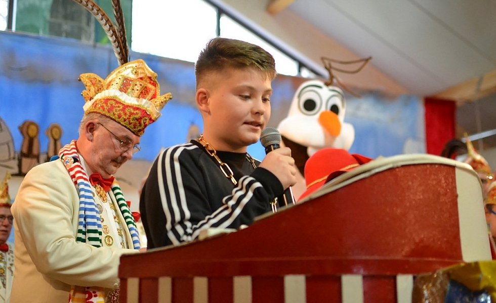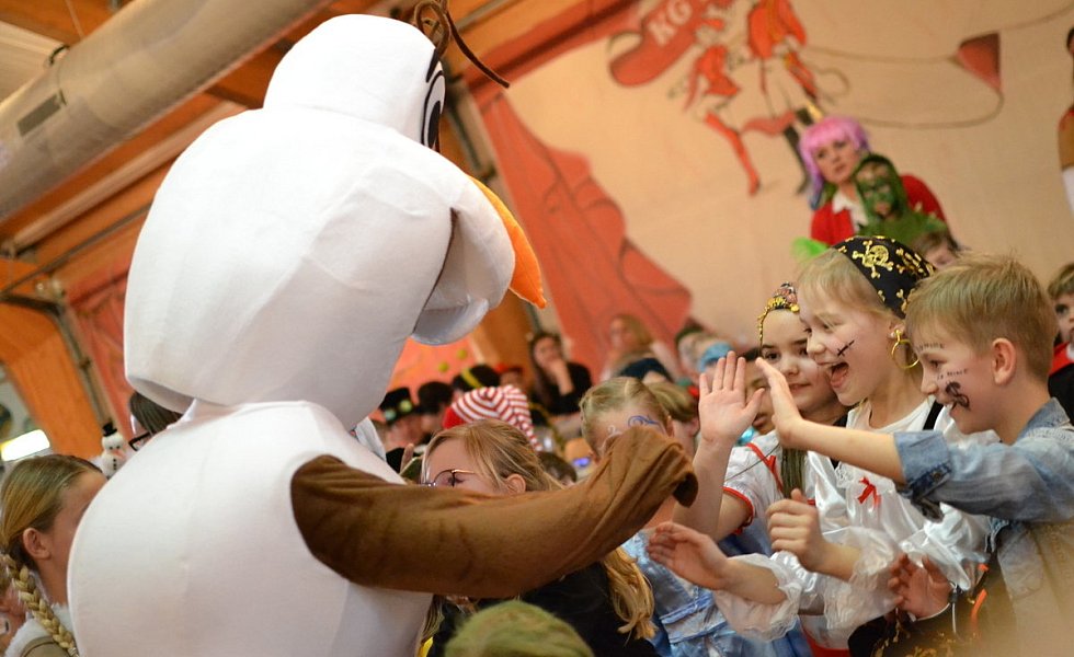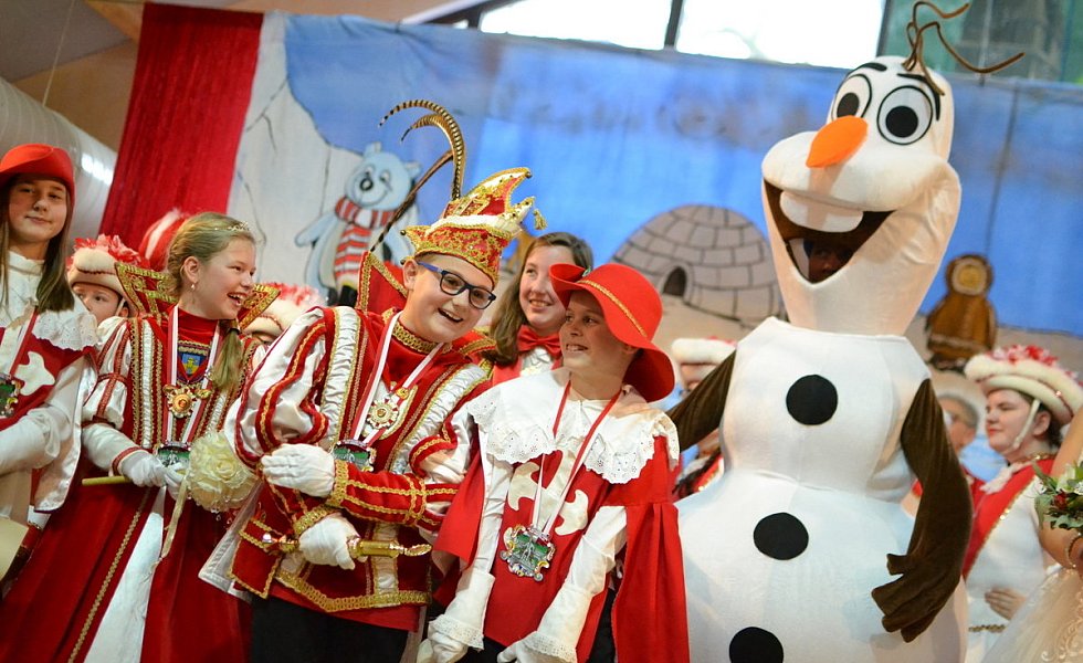 Denn so konnten die beiden Moderatoren des bunten Nachmittags im Schützenhaus, Stefan Bludau und Katharina Schulte, einen lebensgroßen Olaf zum Anfassen und Knuddeln auf der Bühne begrüßen – ein schweißtreibender Job für Prinzenführer Olaf Schröbler, der während der Proklamation des neuen Kinderprinzenpaares Jule I. Focke und Jannis I. Tsigkerliotis unter dem Schneemann-Kostüm ganz schön ins Schwitzen kam.