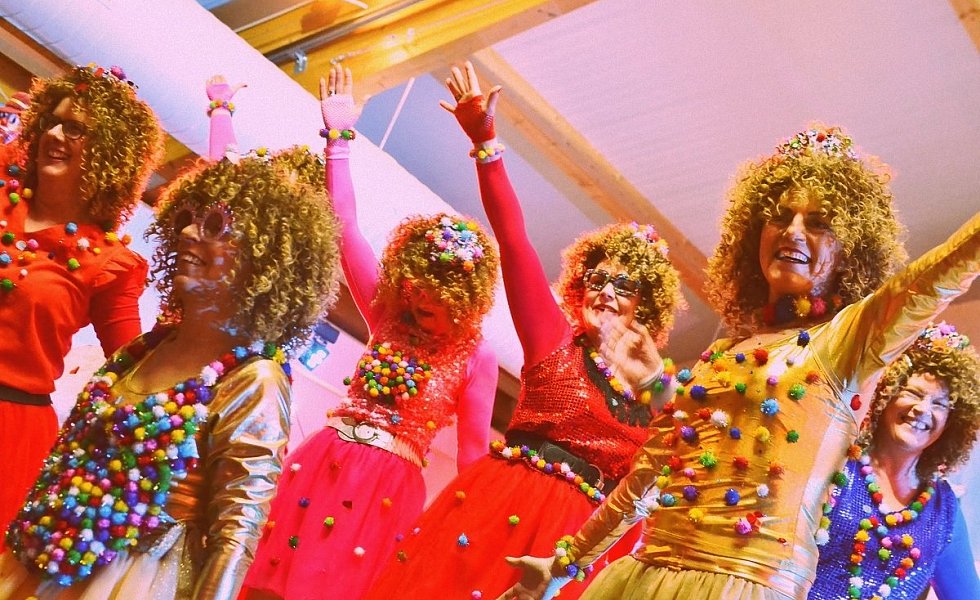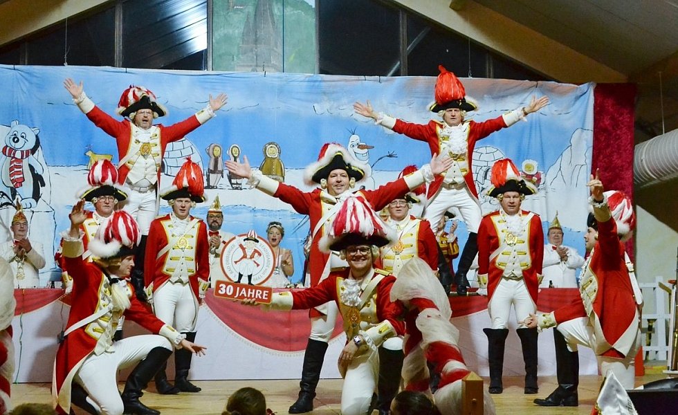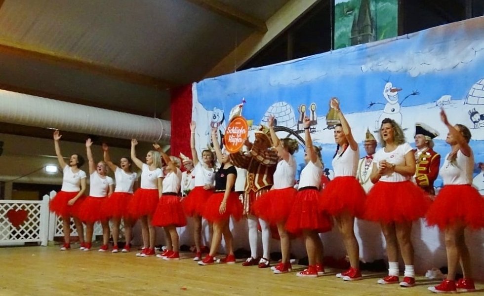 Natürlich durften die „12 Tornados" im Programm nicht fehlen, denn Prinz Jürgen II. ist Mitglied des Männerballetts aus Alhausen. Auch für Prinzessin Stephie II. gab es eine Überraschung: Sie durfte zusammen mit den tanzenden „Schlüpfer Hüpfern" über das närrische Parkett schweben. Die „Pümisser Eleven" beschlossen dann das Bühnenprogramm, aber noch lange nicht den Abend. Denn die Jecken im Schützenhaus hatten sich gerade erst warm gefeiert und ließen noch den einen oder anderen Korken knallen.