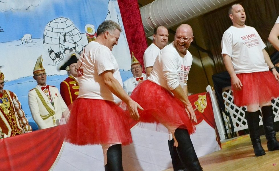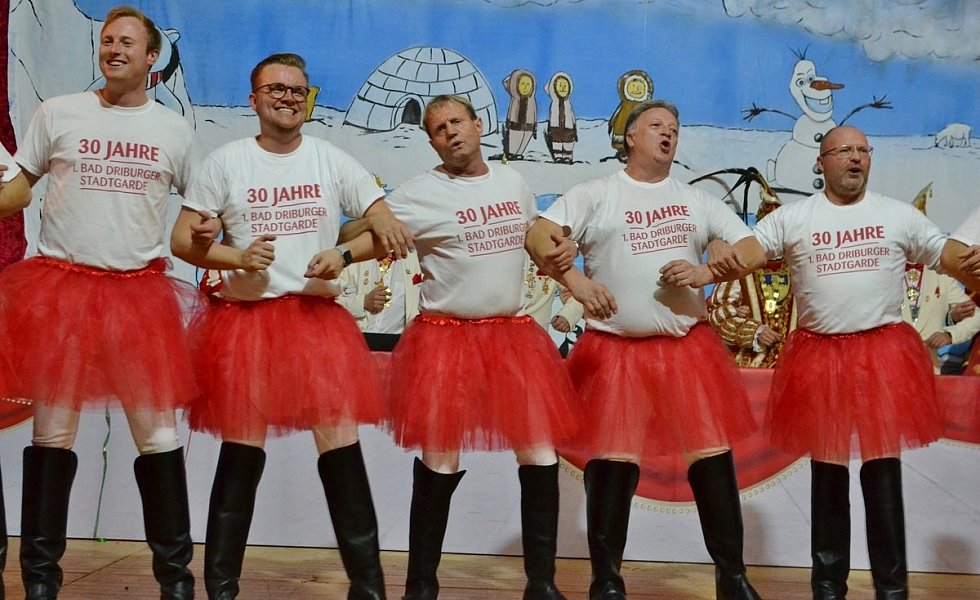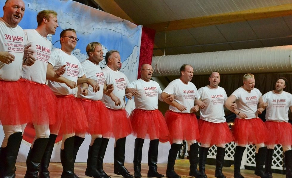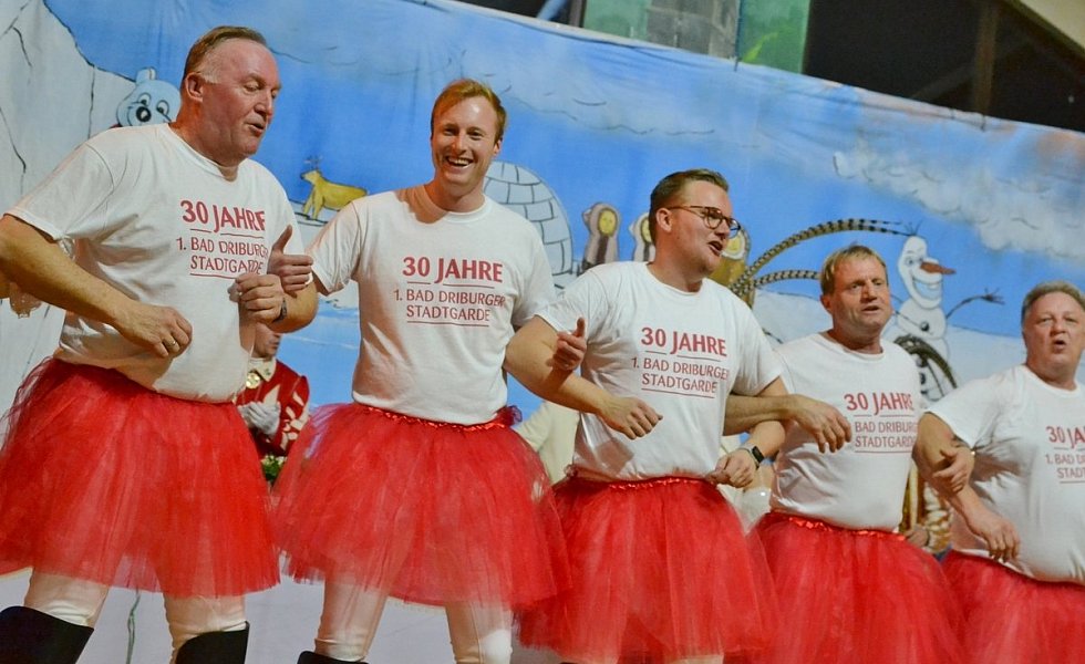 Newcomer Niklas Püttcher, der optisch so gar nicht dem Klischee eines Schlager-Sängers entspricht, sondern eher als Kreisvorsitzender der Jungen Union durchgehen würde, brachte den Saal zum Überkochen mit den bekanntesten Hits der Session. Mit ihrem Gardetanz in roten Tutus erfüllten die Männer der 1. Bad Driburger Stadtgarde, die in diesem Jahr seit 30 Jahren besteht, anschließend ein Gebot des Prinzenpaares. Und die „Glamour Girls" feierten ihren 15. Geburtstag mit einem bunten Konfetti-Tanz.