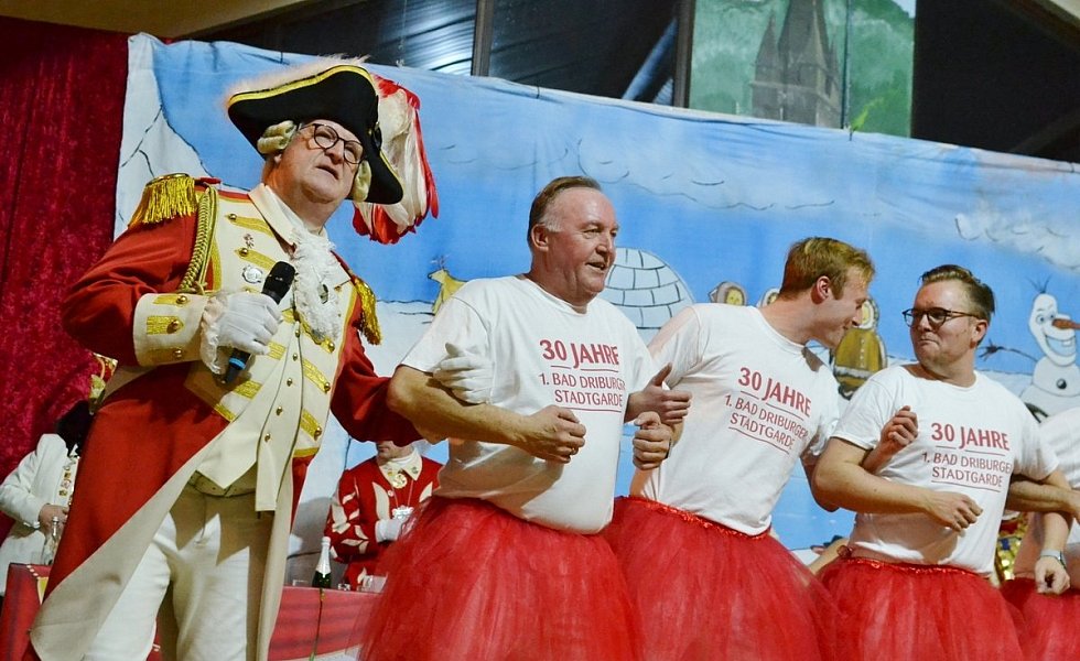 Von der ersten Sekunde an bebte der Saal, steppte der Bär und schunkelte das bunte Jecken-Volk zusammen mit den kleinen, den großen und den jung gebliebenen Tollitäten der Bad Driburger Karnevalsgesellschaft (KG) Rot-Weiße Garde, Kinderprinz Jannis I. „der wortgewandt Charmante" und Kinderprinzessin Jule I. „die Glitzernde von närrischem Blut", Prinz Jürgen II. „der dynamisch Organisierte" und seine Prinzessin Stephie II. „die zauberhaft Kreative" sowie dem Seniorenprinzenpaar Wim Pepers und Annegret Versen.