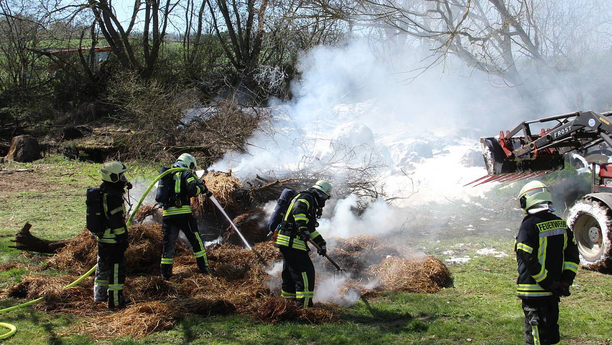 Ein Trupp mit Atemschutzgerät löscht das in Brand geratene Strohlager. | © Burkhard Battran