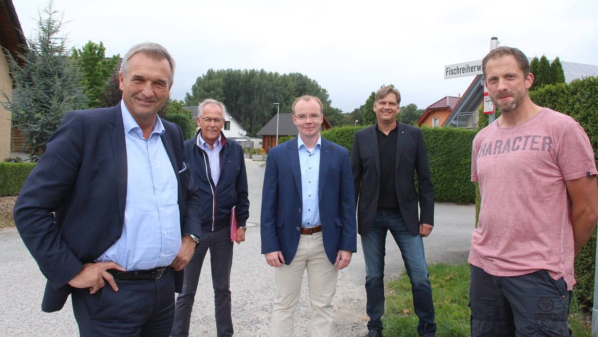 Bürgermeister Burkhard Deppe (v. l.), Bauamtsbereichsleiter Willi Mertens, Bezirksausschussvorsitzender Volker Wiedemeier, Tiefbau-Fachleiter Roland Former und Anwohnervertreter Benedikt Henkst. | © Burkhard Battran