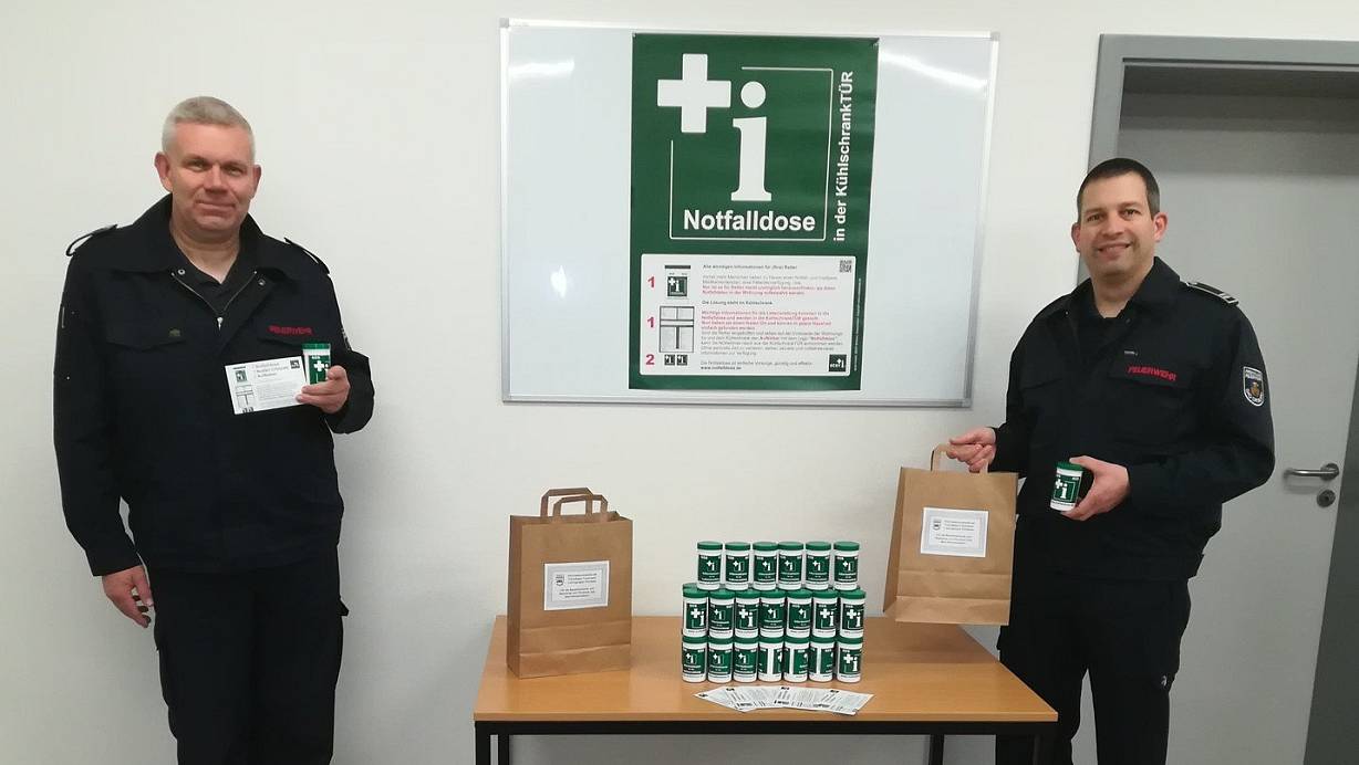 „Damit haben Informationen einen festen Ort und können einfach gefunden werden, ohne dass das Haus oder die Wohnung aufwendig nach Informationen durchsucht werden muss", erklärt Menne. Sehen die Rettungskräfte auf der Innenseite der Wohnungstür oder auf dem Kühlschrank den Aufkleber „Notfalldose", so reicht ein gezielter Griff und die Dose kann aus dem Kühlschrank genommen werden. Alle wichtigen und relevanten Informationen sind sofort verfügbar, die persönlichen Daten des Patienten, Infos zu Vorerkrankungen und zu den Medikamenten, die eingenommen werden, sowie Daten von Angehörigen oder Pflegepersonal.