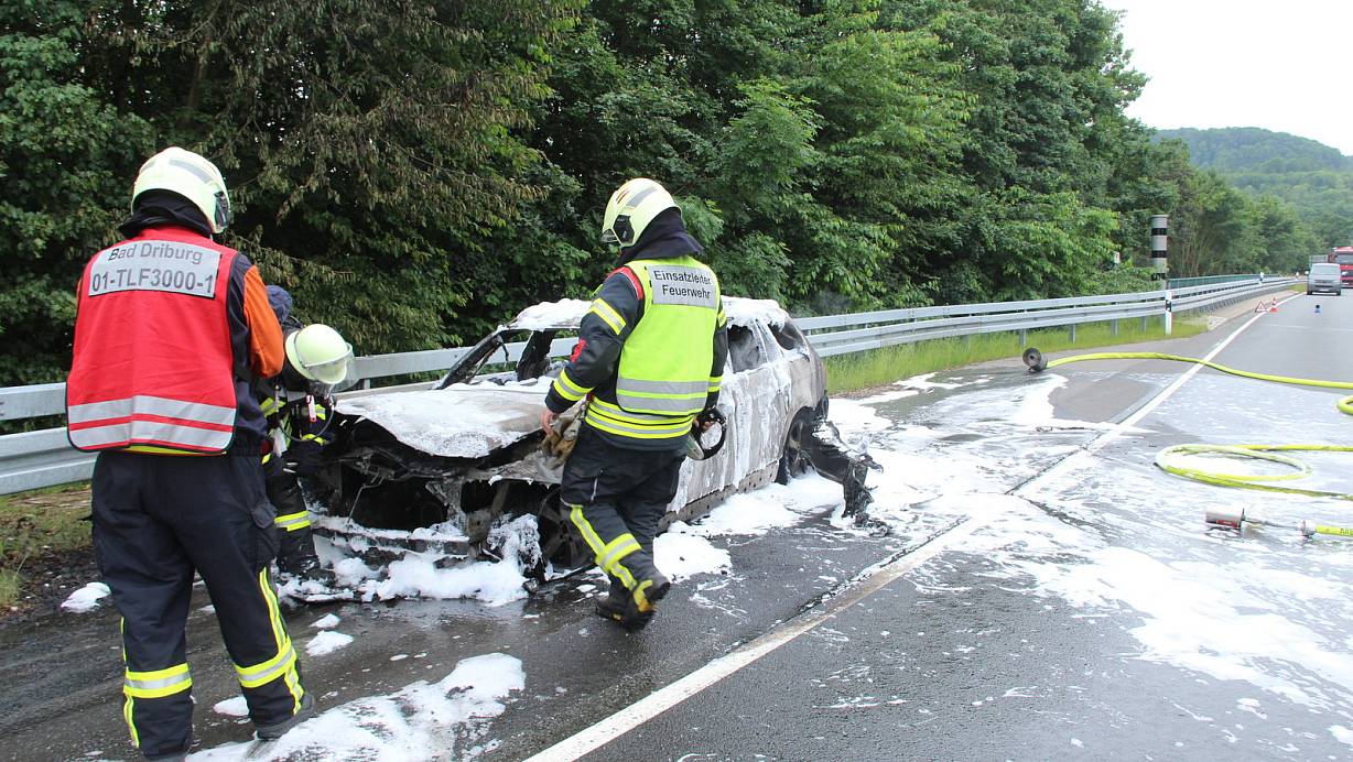 Bad Driburg. Auf der B 64 hat die Feuerwehr Bad Driburg am Mittwochmorgen einen brennenden BMW gelöscht. Der Wagen ist hinüber. Der 35-jährige Fahrer aus Höxter blieb unverletzt. Gegen 11.15 Uhr fuhr der Höxteraner mit seinem 3er BMW auf der B 64 aus Richtung Paderborn nach Höxter. Kurz vor Bad Driburg fuhr er sein Auto in eine Nothaltebucht, nachdem nachfolgende Fahrzeuge ihn mit Lichthupe aufmerksam gemacht hatten. Sie hatten Flammen aus dem Auspuffbereich schlagen sehen.