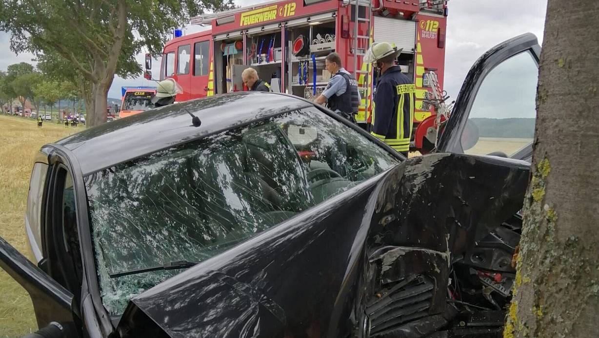 Ein Auto kommt von der Fahrbahn ab und kollidiert mit einem Baum.