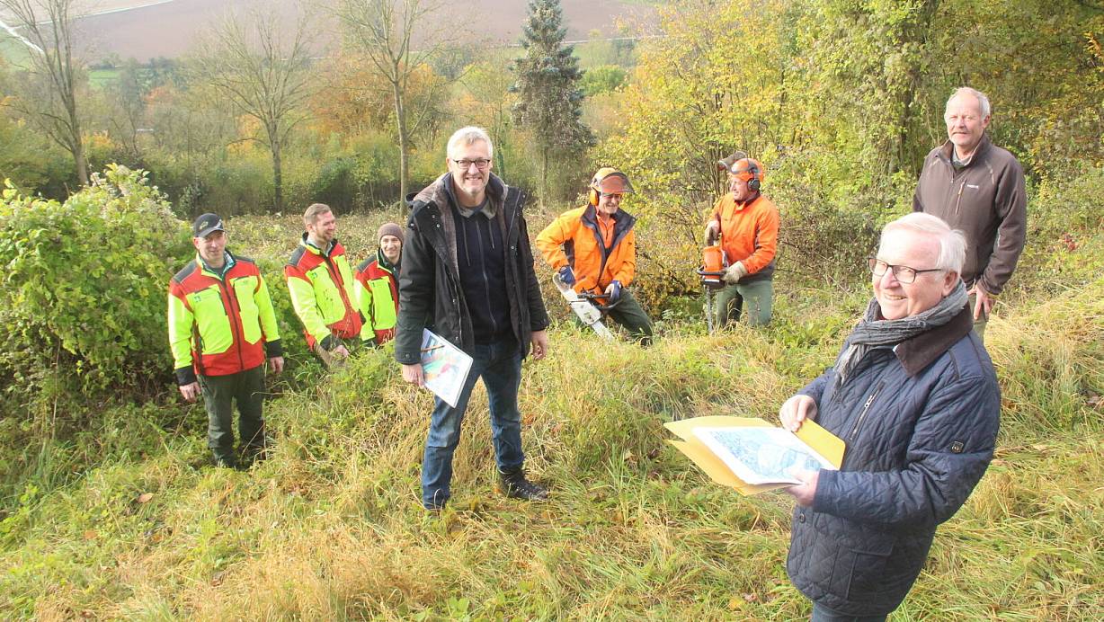 Projektleiter Frank Grawe (v. l.) mit dem Heimatvereinsvorsitzenden Johannes Georg und kooperierendem Landwirt Engelberg Beller sowie den Vertretern und Waldarbeitern des Forstbetriebs. | © Burkhard Battran
