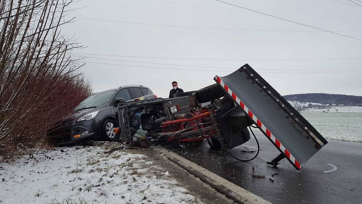 Ein Auto fährt ungebremst auf den Schneeschieber auf. Beide Fahrzeuge werden völlig zerstört.