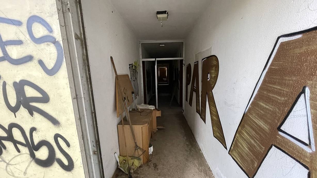Hereinspaziert: Der Blick durch die Tür in den Flur des Hochhauses zeigt, dass auch hier eine Menge Unrat herumsteht, etwa ein alter Laubbesen, bei dem fast alle Zinken abgebrochen sind. | © Ralf T. Mischer