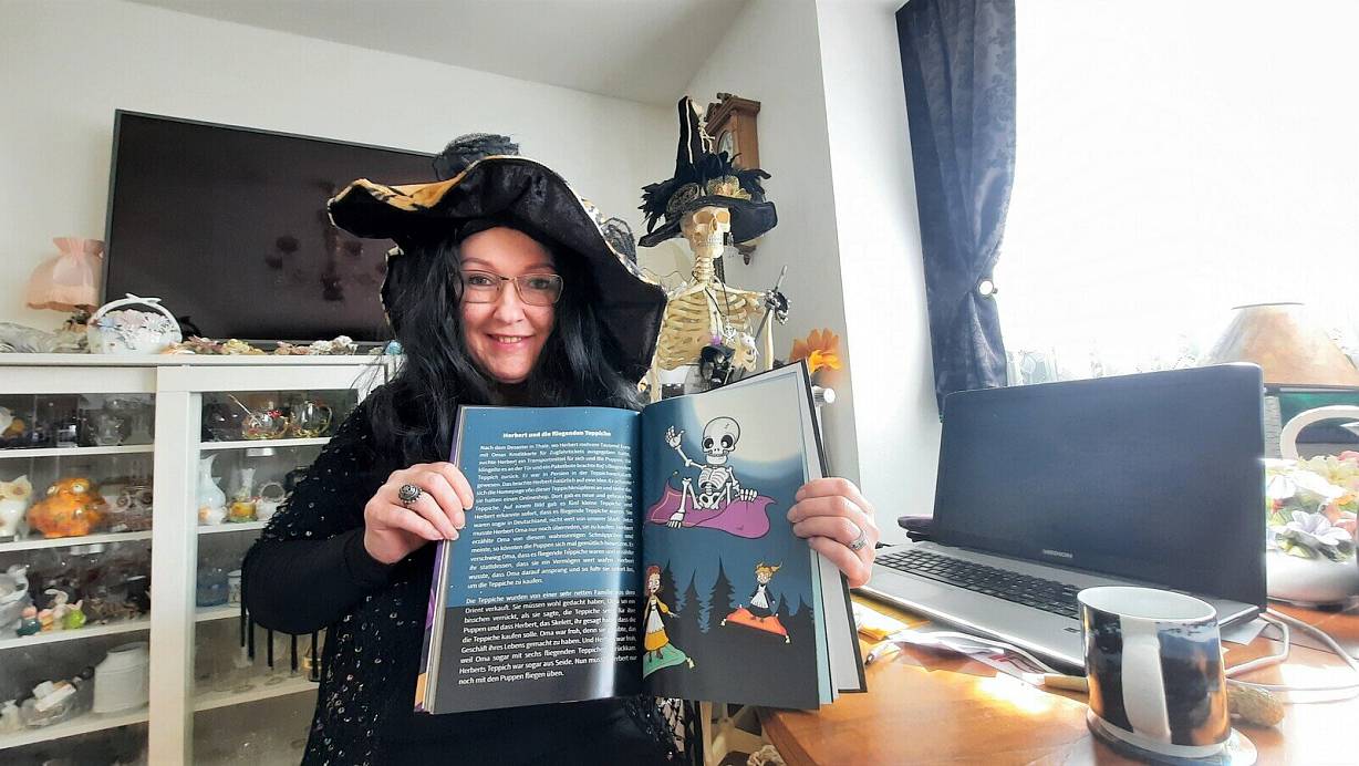 Die Brakeler Autorin Martina Murseli lebt die Rolle der verrückten Hexe durch und durch. Bei ihrer Arbeit schaut ihr oft das Skelett Herbert über die Schulter. Das Skelett hat es als Figur auch ins Buch geschafft – schaurig. | © Madita Schellenberg
