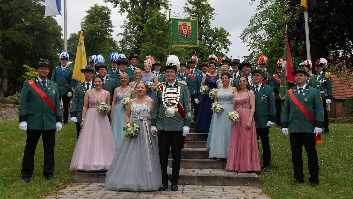 Begleitet wurde das Königspaar von seinem Hofstaat: Joachim Bernard und Claudia Weskamp, Andreas Brandl und Andrea Beller, Stephan Zitzmann und Kathrin Henze, Alexander und Kathrin Mikus, Burkhard und Eva Hake, Holger und Katharina Seifert, Volker und Sabine Mönnikes sowie Manfred und Manuela Falke.